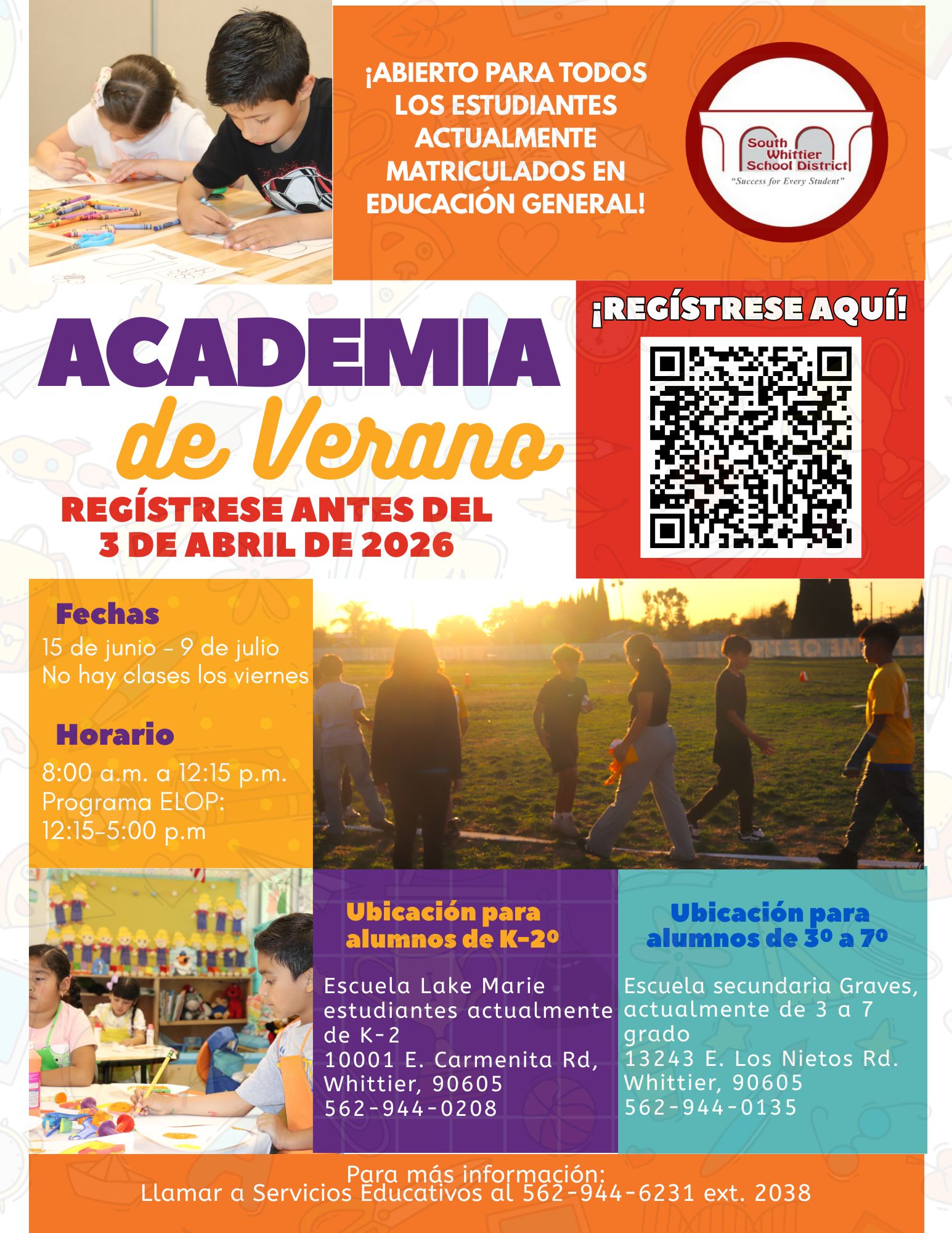Give your child a strong start this summer. South Whittier School District’s Summer Academy is open to all current General Education students and offers a fun, supportive learning environment to build skills and confidence.